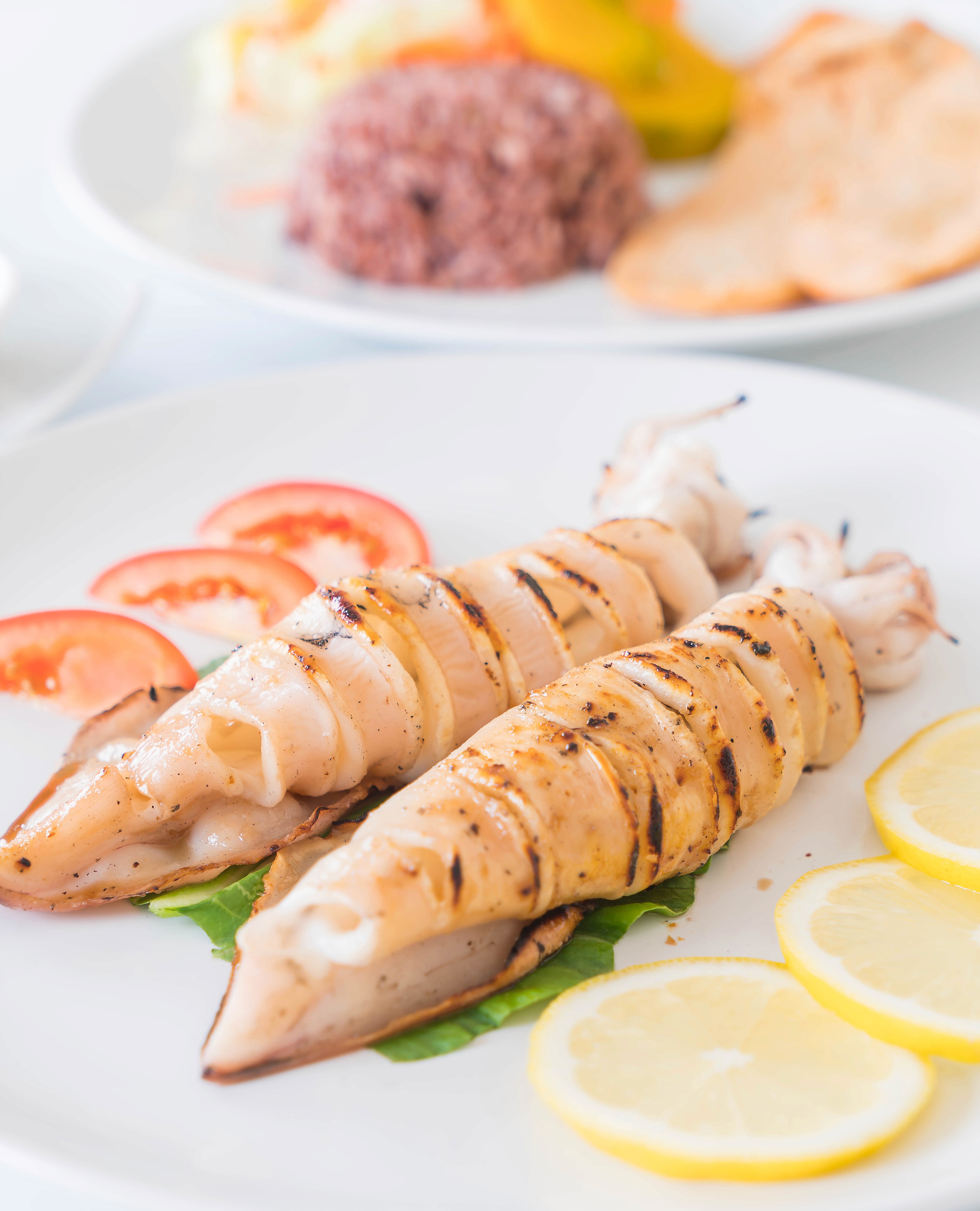 Tender local-style calamari tubes flash-grilled over high heat in garlic-herb butter. Served with a light coriander yogurt.